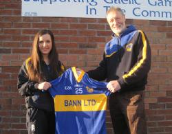 Maghery Sean McDermott's Club President, Bosco Campbell, presents Rós Hendron, representative of the club's hugely successful Scor team, with the club colours that Rós will wear whilst singing Amhrán na bhFiann before the Armagh Vs Galway Match in the Athletic Grounds on the 7th April
